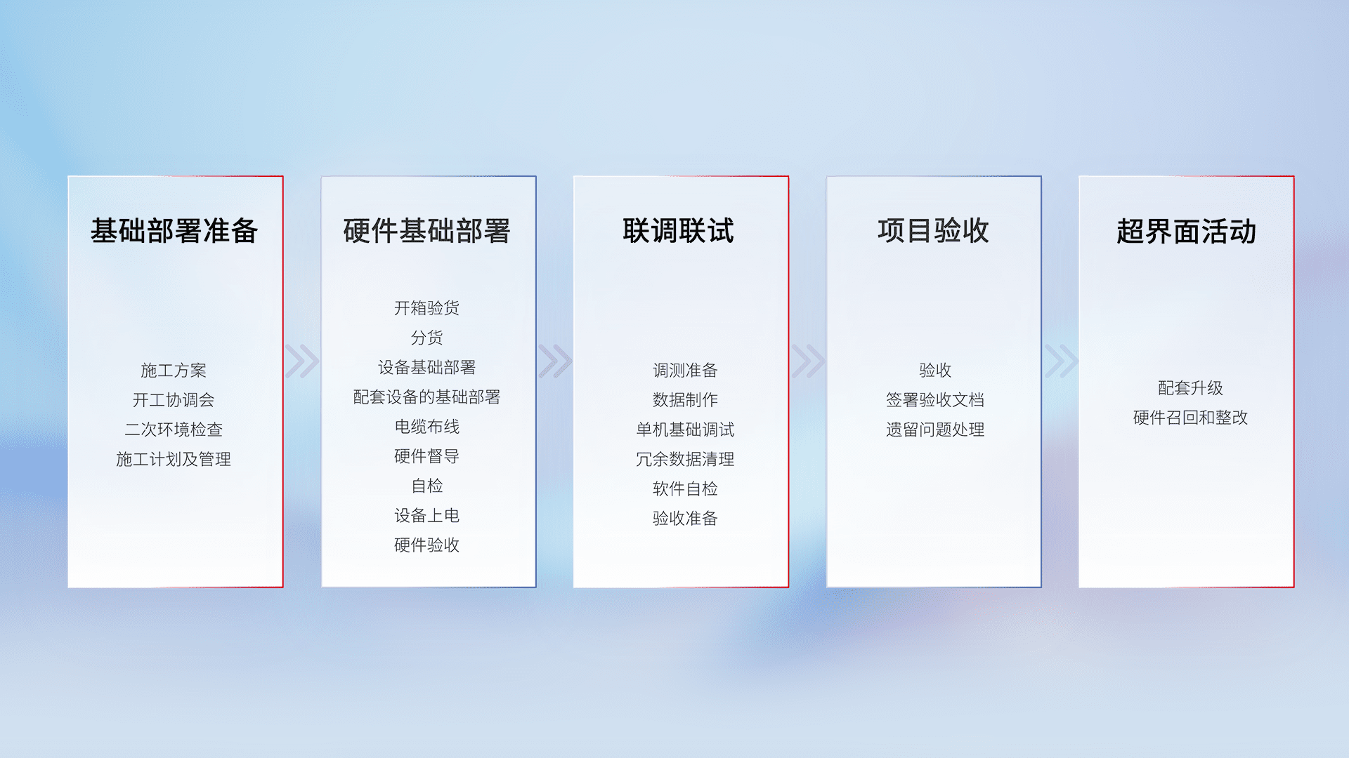 从基础部署准备、、硬件基础部署、、、、联调联试、、、、项目验收、、、、越界面活动的全过程可追溯,,,,保证施工质量和进度。。